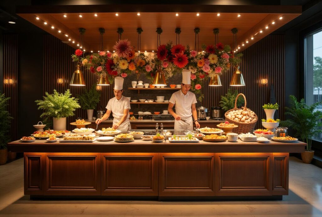 Interactive cooking experiences with skilled chefs preparing fresh meals on-site.